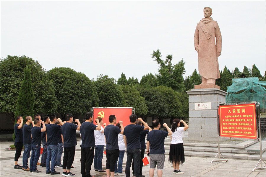 在楊闇公烈士陵園,全體黨員在烈士紀念碑前面對黨旗重溫入黨誓詞,并莊嚴承諾不忘初心跟黨走,牢記使命勇?lián)敗?/p>