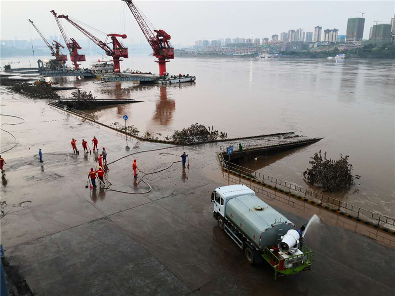 8月21日,隨著(zhù)長(cháng)江五號洪峰過(guò)境,重慶港口水位逐漸降低,防汛重點(diǎn)轉向清掃消殺工作。