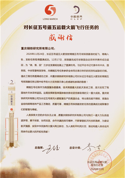 近日,中國航天科技集團有限公司第一研究院長(cháng)征五號運載火箭型號辦公室向重慶鋼研公司發(fā)出感謝信,對重慶鋼研公司在長(cháng)征五號遙五火箭發(fā)射嫦娥五號探測器任務(wù)過(guò)程中給予的大力支持表示衷心的感謝和崇高的敬意。