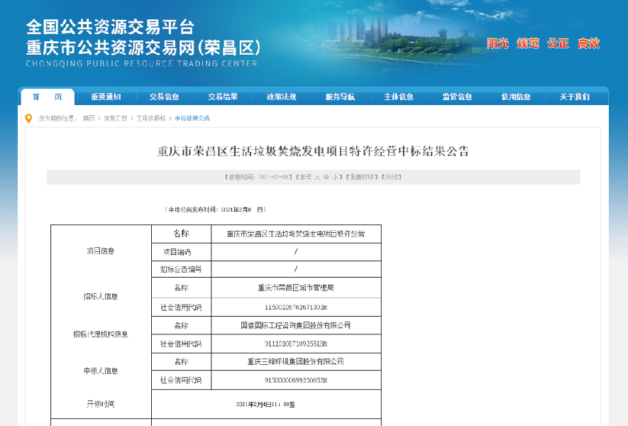 三峰環(huán)境中標重慶榮昌垃圾焚燒發(fā)電項目