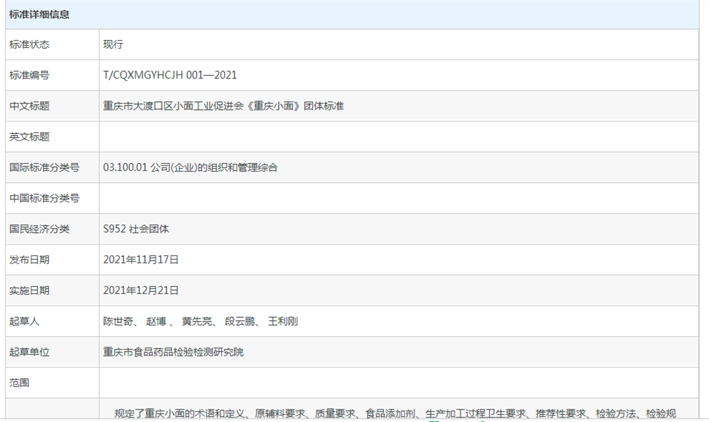 該團體標準明確規定了重慶小面的生產(chǎn)區域范圍、產(chǎn)品分級、實(shí)物標準樣及試驗方法和檢驗規則等,適用于重慶小面的生產(chǎn)加工和流通貿易。