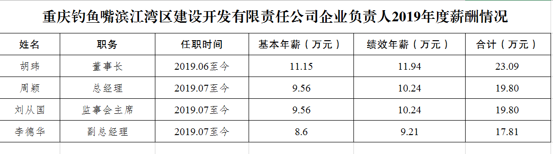 重慶釣魚(yú)嘴濱江灣區建設開(kāi)發(fā)有限責任公司企業(yè)負責人2019年度薪酬情況
