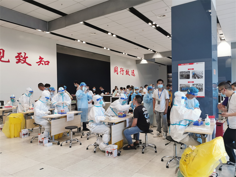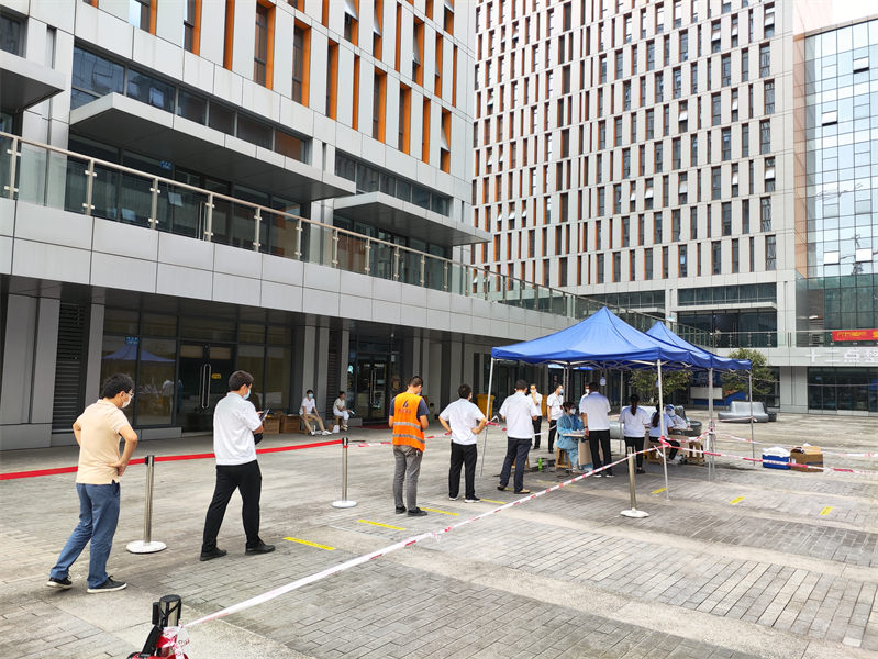 這只是設置在建橋園區核酸采樣點(diǎn)中的一個(gè)縮影。24號當天,10個(gè)這樣的采樣點(diǎn),分散在建橋A、B、C三個(gè)區,醫護工作者、園區工作人員、志愿者等分工協(xié)作,在烈日下,在廣場(chǎng)中,堅守各自崗位,與高溫戰斗,為企業(yè)員工服務(wù),汗流浹背不喊一聲累,力求做到應檢盡檢、不漏一人。
