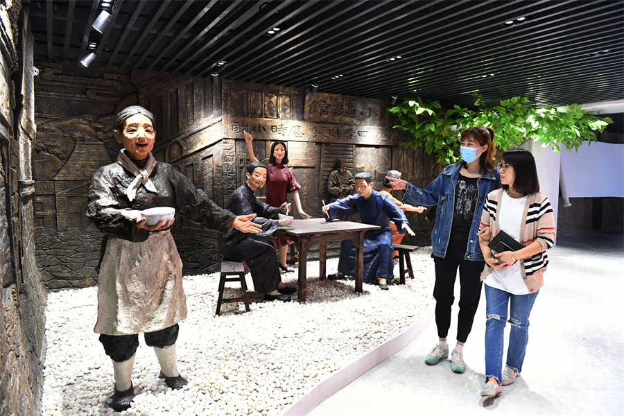 序廳內,雕塑場(chǎng)景展現“從義渡口走出的第一碗小面”,展覽館內有非?,F代的體驗設計,在“調料地圖”大屏前,參觀(guān)者只要觸摸一下按鈕,大屏上可以立即顯示榮昌豬、江津花椒、大足冬菜、涪陵榨菜、石柱辣椒、忠州豆腐乳的簡(jiǎn)介,這些都是一碗小面的絕味食材成分。這里充滿(mǎn)現代科技氣息,參觀(guān)者能沉浸式感知重慶小面文化,輕松了解重慶小面發(fā)展的前世今生。